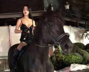 一名上身著吊帶衫、腳穿長筒靴的長發女子,騎著一匹高頭大馬,沿著延安西路[詳細]